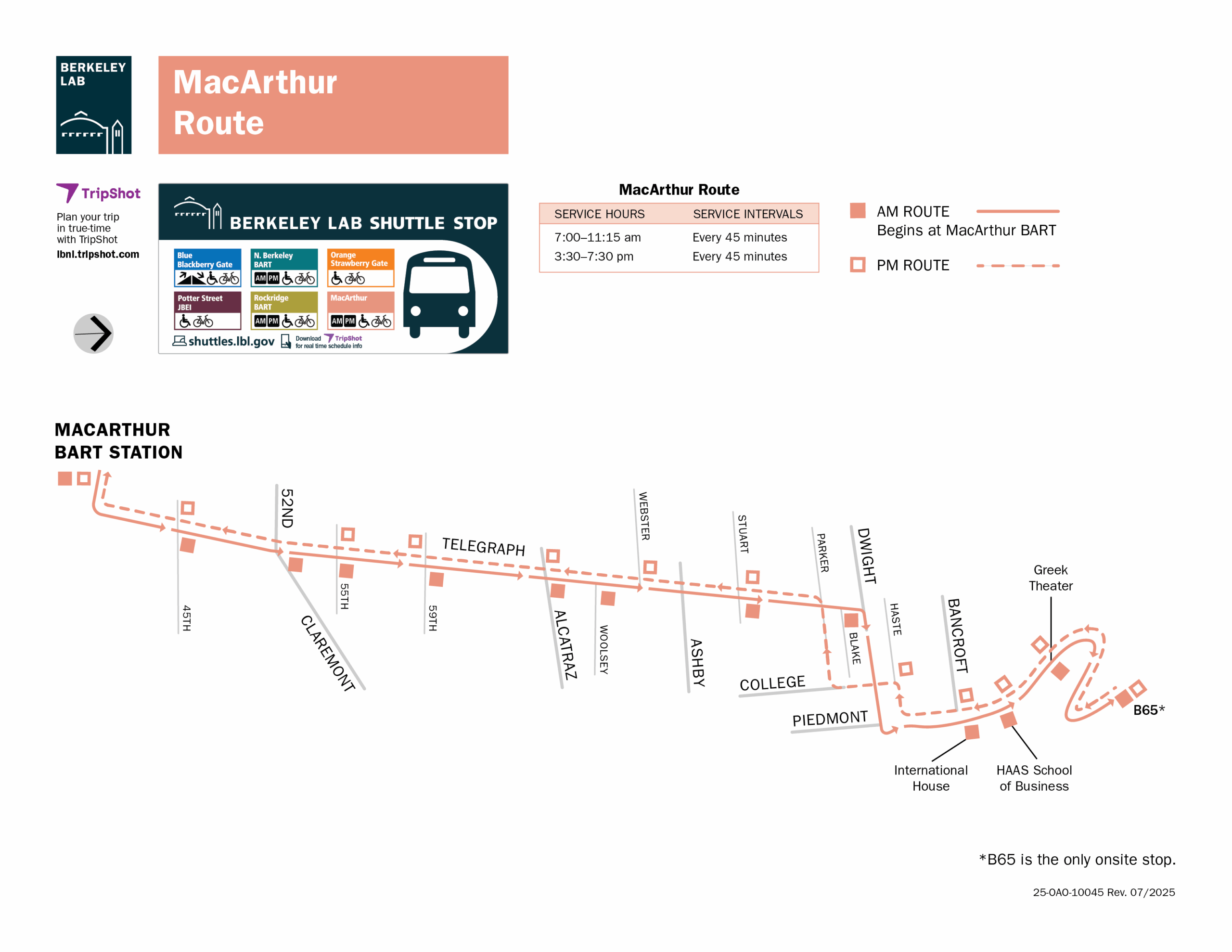 The Lab uses the Bus Stop on the BART Access Road, located south of 39th St: MacArthur Route Bus Stop. We share this area with the CalTrans Bike shuttle and a Golden Gate Transit Early Bird Express bus.
